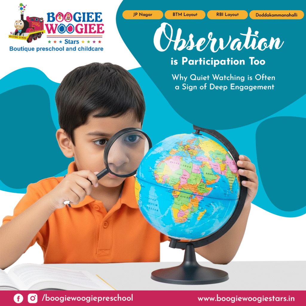 At Boogiee Woogiee Preschool in JP Nagar – a premier preschool chain in Bangalore – not every child jumps into an activity with immediate enthusiasm. Some children sit back, watch quietly, and take it all in before making a move. To the untrained eye, it might seem like these children aren’t participating. But in reality, they are deeply engaged. Observation, in early childhood, is not passive. It is purposeful.