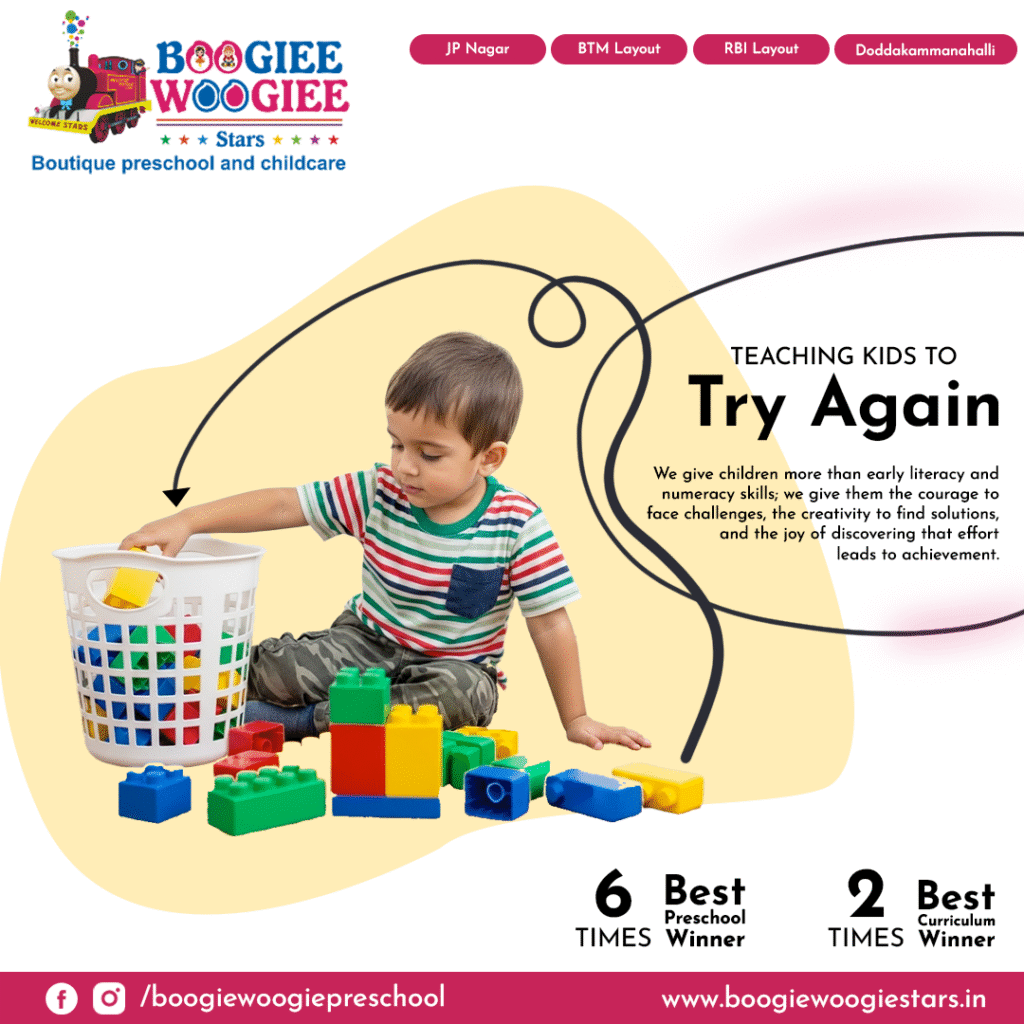 Children are naturally curious, but persistence – the willingness to keep trying even after failure – is something they have to learn. At Boogiee Woogiee Preschool, one of the best preschool chains in Bangalore, we believe that teaching children to embrace challenges without fear is just as important as teaching them to read or count. A child who learns to try again, and even enjoy the process, is laying the foundation for resilience, confidence, and lifelong learning.