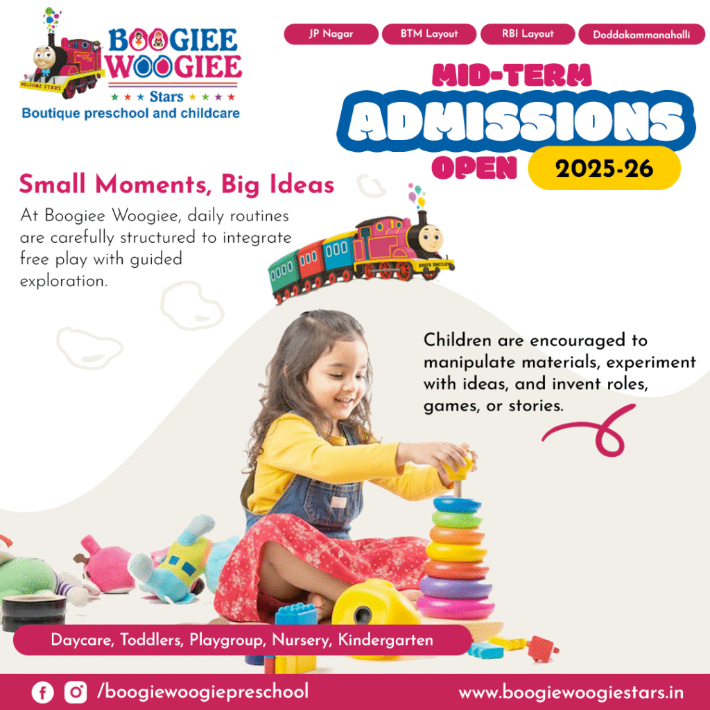 Originality doesn’t always arrive with a grand gesture or a polished masterpiece. Often, it first appears in a small, quiet moment-a child stacking blocks in a pattern no one has imagined, combining colors in an unexpected way, or inventing a game from the simplest of materials. At Boogiee Woogiee Preschool, JP Nagar, one of the best preschool chains in Bangalore, we understand that these early sparks of creativity are powerful indicators of independent thinking and cognitive growth.