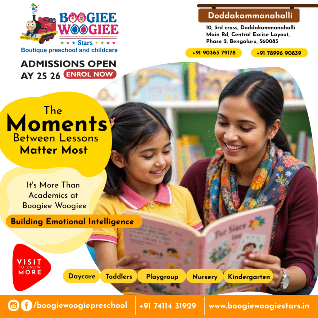 When parents think about preschool, it’s natural to focus on early academic skills – learning to read, mastering numbers, recognizing shapes and colors. At Boogiee Woogiee Preschool, Doddakammanahalli, while we wholeheartedly believe in building strong academic foundations, we also understand something even more profound: the moments between lessons often shape a child’s growth just as much as formal teaching does.