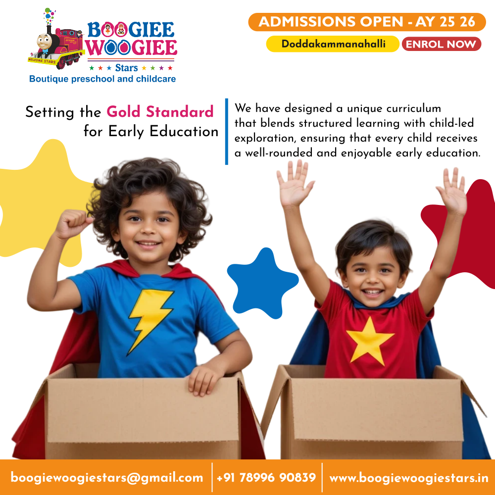 A Safe and Nurturing Environment – Secure premises with CCTV surveillance, child-friendly infrastructure, and a warm, welcoming atmosphere. A Proven Track Record – Boogiee Woogiee is recognized as the best preschool chain in Bangalore, trusted by hundreds of families. A Balanced Approach to Learning – A perfect mix of academics, play, creativity, and life skills. A Joyful and Enriching Experience – Children love coming to school because learning here is fun, engaging, and meaningful.