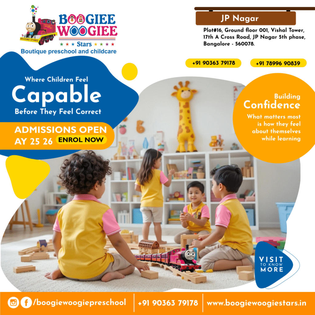 At Boogiee Woogiee Preschool, JP Nagar, we believe that a child must feel capable before they are expected to be correct. It is a philosophy that shapes our classrooms, our teaching approach, and our daily interactions with every child. Because when children feel empowered, when they believe in themselves, real learning begins.