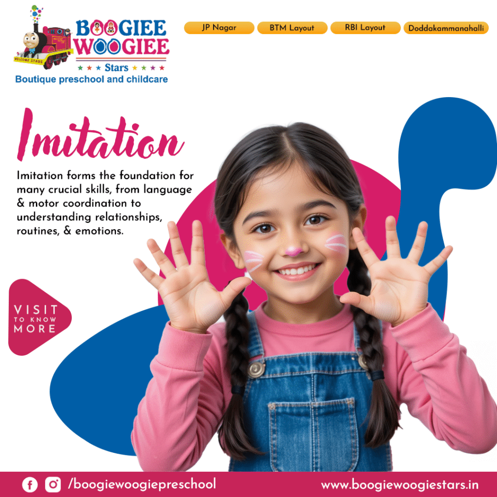 At Boogiee Woogiee Preschool in JP Nagar, we know that toddlers are passionate imitators – following their parents’ routines, repeating their words, and recreating their gestures. This isn’t just charming or sweet; it’s a powerful way for children to learn about their world. Imitation forms the foundation for many crucial skills, from language and motor coordination to understanding relationships, routines, and emotions.