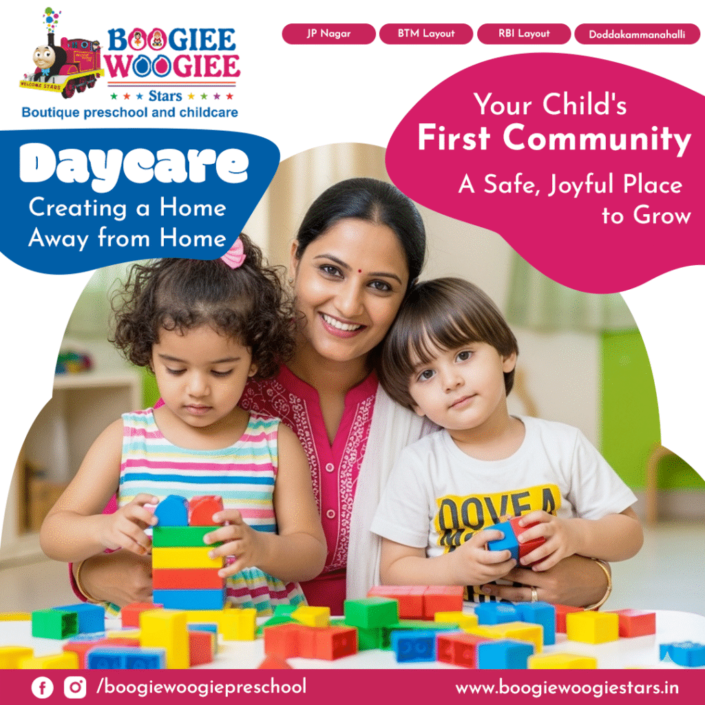 When you think of daycare, it’s easy to picture a safe space where children are supervised while parents work. But the best daycare centers are so much more than that. They’re places where curiosity blooms, friendships form, and young children experience their first taste of belonging to a community outside of home. At Boogiee Woogiee Preschool in JP Nagar, part of one of the best preschool chains in Bangalore, we view daycare as a child’s first real social neighborhood – a warm, nurturing environment that shapes far more than daily routines.